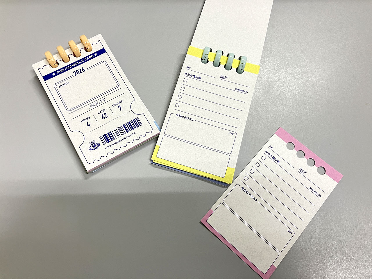 北陽の生徒たちは、提出課題や小テストの数が多く、タブレットの使用ができない状況下でふいにスケジュールを知らせられることが多々あり、全部を覚えてられないという悩みから、ぱっと使えるメモツールが欲しい!というところから考えられたアイテムです。